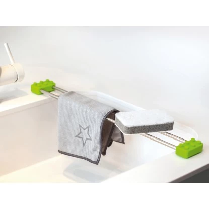 Der praktische drip. line in Grau wird im Bereich der Spüle eingesetzt. Zum einen eignet er sich als Abtropfmöglichkeit für nasse Schwämme, Tücher oder Bürsten als auch zum schrägen Abtropfen von Trinkflaschen oder anderen Gefäßen. Dank Teleskopfunktion ist der drip.line von 32,5 cm bis 56,5 cm ausziehbar und passt sich somit jeder Spüle an. Durch die Enden aus Silikon kann er unkompliziert und ohne Befestigung einfach über die Spüle gelegt werden oder auch außerhalb der Spüle zum Einsatz kommen. Er besteht aus gebürstetem Edelstahl und ist bis max. 1,5 kg belastbar. Der Artikel ist hitzebeständig bis 220 °C und auch spülmaschinenfest. Er ist platzsparend und in jeder Schublade verstaubar.