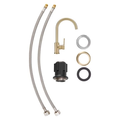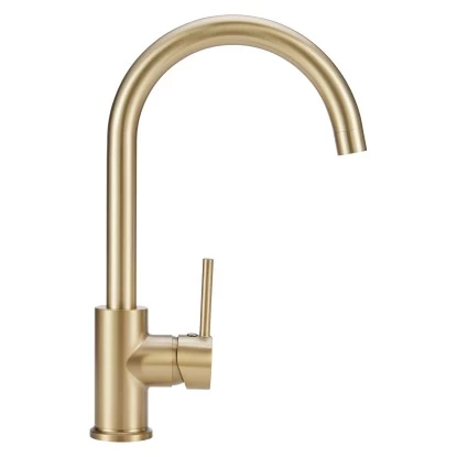 Die baliv Küchenarmatur KI-1833 fällt mit ihrem hohen und gebogenen Auslauf direkt ins Auge. Ihr edles und zeitloses Design in Gold passt zu sämtlichen Küchenstilen. Und dank nützlicher Extras verschafft dir die Armatur noch mehr Erleichterung in deiner Küche. Das Spülbecken zu reinigen oder bequem dein Geschirr abzuwaschen, geht mit der schwenkbaren Armatur ganz leicht. Den Auslauf kannst du um ganze 360° drehen. Und durch die Kaltstart-Funktion sparst du Energie, da nur dann warmes Wasser verwendet wird, wenn es wirklich gewünscht wird.