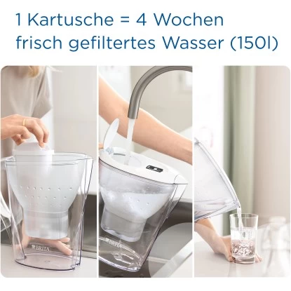 Mit der Brita Wasserfilter-Kanne Marella wird jeder Wasserhahn zu einer Quelle für frisch schmeckendes Wasser, das nie ausgeht. Die 4-stufige Filtration mit natürlicher Aktivkohle aus Kokosnussschalen & Ionenaustauscher-Perlen reduziert Kalk, geschmacksbeeinträchtigendes Chlor und Metalle wie Blei & Kupfe und filtert Verunreinigungen aus bestimmten Herbiziden, Pestiziden und Medikamenten.