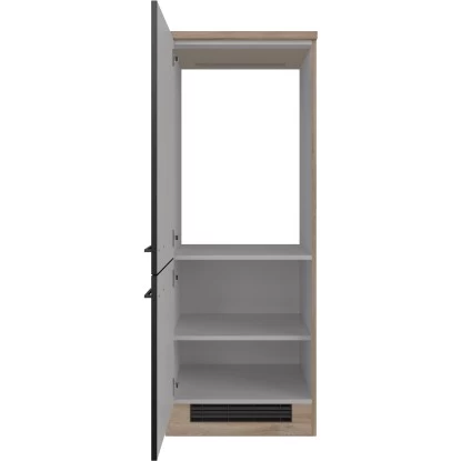 Der Flex-Well Exclusiv Demi-Geräteumbauschrank Capri 60 cm Schwarz Matt-Endgrain Oak überzeugt durch eine geradlinige Formgebung und zeichnet sich durch ein modernes Ambiente aus. Dabei bietet Ihnen der Demischrank ein reizvolles Design in der Farbe Schwarz Matt kombiniert mit Endgrain Oak und eignet sich optimal als passende Ergänzung zur gleichnamigen Küchenserie. Dieser kompakte Demi-Geräteumbauschrank hat eine Gesamthöhe von 161 cm und verfügt über eine Abdeckplatte, zwei Drehtüren, einen verstellbaren Einlegeboden, eine 88 cm hohe Nische für einen Einbaukühlschrank und über zwei Lüftungsgitter. Die Lieferung erfolgt zerlegt zum Selbstaufbau. Eine aussagekräftige Aufbauanleitung liegt im Paket.