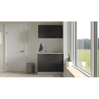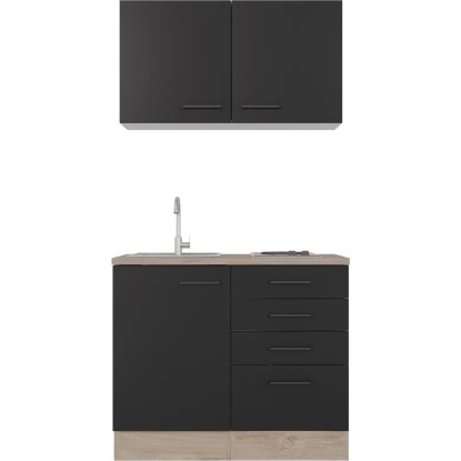 Die Flex-Well Exclusiv Miniküche Capri 100 cm Schwarz Matt-Endgrain Oak ist bestens für die erste Wohnung, den Single-Haushalt, Ferienwohnungen oder das Büro geeignet. Die 100 cm breite Küche überzeugt durch ihr Design und die vielfältigen Funktionen. Die Türen der Schränke sind für den wechselseitigen Aufbau geeignet, was Ihnen ein Höchstmaß an Flexibilität bei der Montage bietet. Die hochwertigen und pflegeleichten Kunststofffronten sowie die stabile Bauweise der Schrankkörper bieten Ihnen lange Freude an Ihrer Küche.