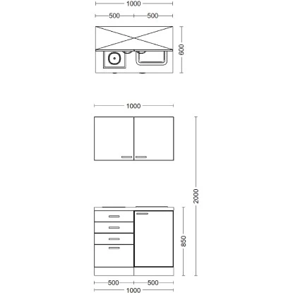 Die 100 cm breite Single-Küchenzeile besteht aus (H x B x T):