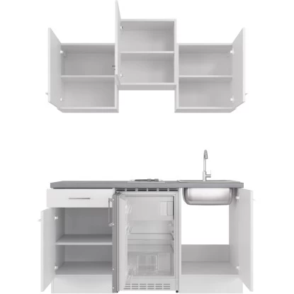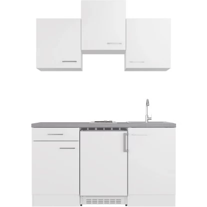 Top-Qualität „Made in Germany“ zum kleinen Preis. Die ideale Küche für Singles, Praxis- und Büroräume. Die klassische Singleküche zeichnet sich durch ein Höchstmaß an Flexibilität aus und verspricht Ihnen eine komfortable Funktionalität auf kleinstem Raum. Die 150 cm breite Küchenzeile verspricht Ihnen nicht nur genügend Stauraum bei einem begrenztem Platzangebot, sondern ist darüber hinaus auch bereits mit einem integrierten Unterbau-Kühlgerät sowie einer 2-Platten-Kochmulde ausgestattet.