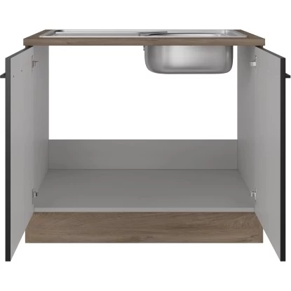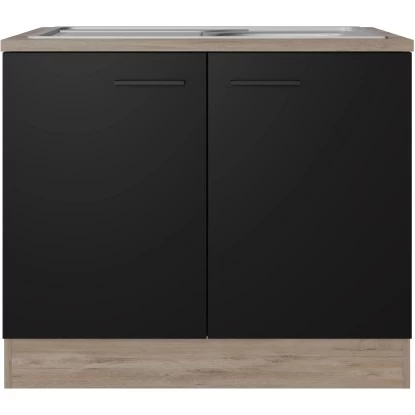 Der Flex-Well Exclusiv Spülenunterschrank Capri 100 cm Schwarz Matt-Endgrain Oak überzeugt durch eine geradlinige Formgebung und zeichnet sich durch ein modernes Ambiente aus. Dabei bietet Ihnen der Spülenunterschrank ein reizvolles Dekor in der Farbe Matt schwarz kombiniert mit Endgrain Oak und eignet sich optimal als passende Ergänzung zur gleichnamigen Küchenserie. Der Spülenunterschrank verfügt neben zwei Drehtüren und einer Arbeitsplatte auch über eine Edelstahl-Einbauspüle mit Ab- und Überlaufgarnitur. Die Lieferung erfolgt zerlegt zum Selbstaufbau. Eine aussagekräftige Aufbauanleitung liegt im Paket. Ein Siphon muss bauseits besorgt werden.