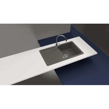 Bei der Spüle handelt sich um ein eckiges Einzelbecken mit einer Abtropffläche auf der linken Seite. Es wird ein Arbeitsplattenausschnitt von (B x L) 84 cm x 48 cm benötigt. Das Becken hat eine Länge von 38,5 cm und eine Breite von 43,2 cm.