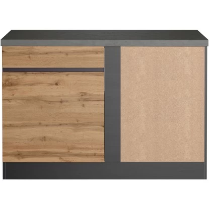 Mit dem Küchen-Eckschrank Turin von Held Möbel mit hochwertigen MDF-Fronten können Sie ihre Küchenzeile perfekt ergänzen. Hinter der Drehtür befinden sich zwei Ablagefächer. Optisch begeistert der Schrank durch die klaren Linien sowie die zweifarbige Gestaltung. Da der Schrank in zwei Farbkombinationen verfügbar ist, können Sie die Küche im Mix-and-Match Stil einrichten.