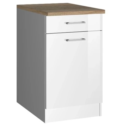 Der Küchenunterschrank von Held Möbel aus der Serie Mailand zeichnet sich durch seine hochglänzende MDF-Front, attraktivem Metallgriff sowie der pflegeleichten Korpus-Kunststoffoberfläche aus. Der Schrank innen ist in Weiß gehalten und geht mit einem Einlegeboden daher. Zusätzlich findet sich hier ein Schubkasten auf leichtgängigen Metallschienen und eine 28 mm starke Arbeitsplatte im Eiche Dekor.