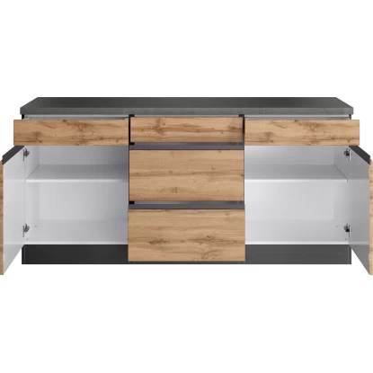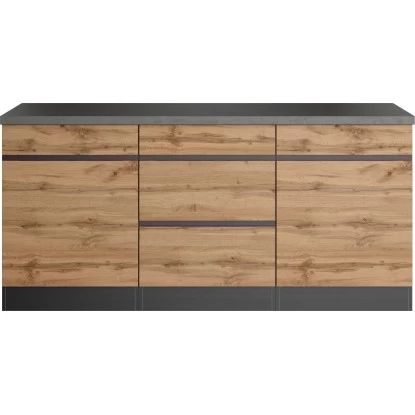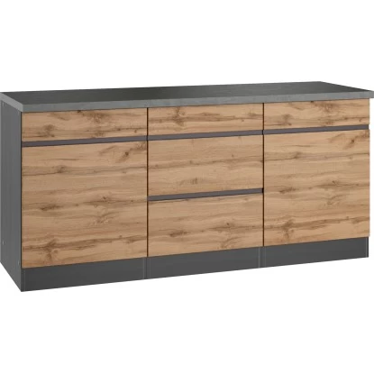 Mit dem Unterschrank Turin von Held Möbel mit hochwertigen MDF-Fronten können Sie ihre Küchenzeile perfekt ergänzen. Hinter den Drehtüren befinden sich je zwei Ablagefächer ergänzt werden diese durch zwei Auszüge und drei Schubkastenelemente. Optisch begeistert der Unterschrank durch die klaren Linien sowie die zweifarbige Gestaltung. Da der Schrank in zwei Farbkombinationen verfügbar ist, können Sie die Küche im Mix-and-Match Stil einrichten.