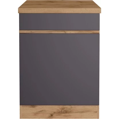 Mit dem Küchenunterschrank Turin von Held Möbel mit hochwertigen MDF-Fronten können Sie ihre Küchenzeile perfekt ergänzen. Hinter der Drehtür befinden sich zwei Ablagefächer ergänzt werden diese durch ein Schubkastenelement für z.B. Besteck. Optisch begeistert der Unterschrank durch die klaren Linien sowie die zweifarbige Gestaltung. Da der Schrank in zwei Farbkombinationen verfügbar ist, können Sie die Küche im Mix-and-Match Stil einrichten. Eine 28 mm starke Arbeitsplatte in Eiche Dekor ist inklusive.