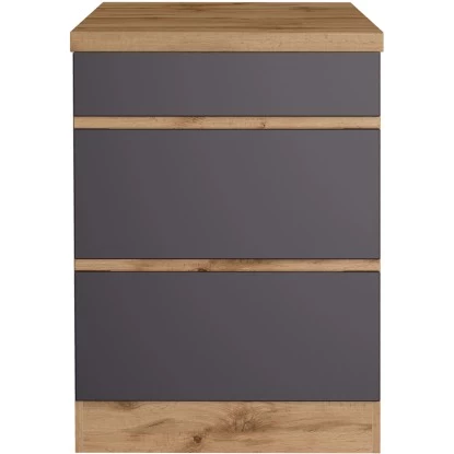 Mit dem Küchenunterschrank Turin von Held Möbel mit hochwertigen MDF-Fronten können Sie ihre Küchenzeile perfekt ergänzen. Zwei Auszüge sowie ein kleiner Schubkasten bieten genug Stauraum für Besteck, Töpfe und andere Küchenutensilien. Optisch begeistert der Unterschrank durch die klaren Linien sowie die zweifarbige Gestaltung. Da der Schrank in zwei Farbkombinationen verfügbar ist, können Sie die Küche im Mix-and-Match Stil einrichten. Eine 28 mm starke Arbeitsplatte in Eiche Dekor ist inklusive.