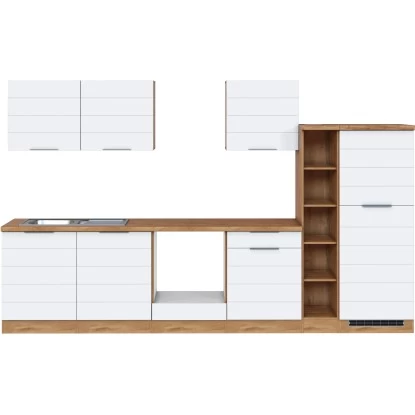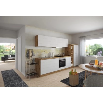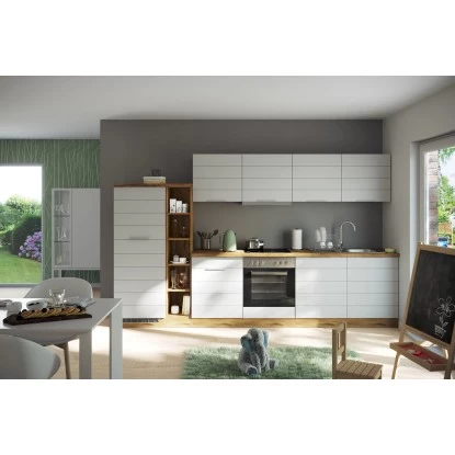 Die Küchenserie FLORENZ besticht durch ihre 2 absolut trendstarken Dekorkombinationen, in denen immer das ausdrucksstarke Wotan-Eichedekor eine entscheidende Rolle spielt. Elegante Metall-Griffleisten an hochwertigen MDF-Fronten mit Lisene in Mattweiß und Mattgrau werden mit einem ausdrucksstarken Eichedekor beim Korpus und der Arbeitsplatte kombiniert. So entsteht eine herausragende Optik, die genau den aktuellen Trend widerspiegelt. Eine Vielzahl an vordefinierten Zeilen und Winkel und verschiedenste Ergänzungsmöbel lassen keine Wünsche offen. In den Auszügen und hinter den Türen wird reichlich Stauraum für Küchenutensilien, Kochgeschirr und mehr geboten. Als Montagehilfe sind die einzelnen Schränke mit höhenverstellbaren Ausgleichsfüßen ausgestattet. Bestimmt werden Sie hier Ihre perfekte Küche finden!