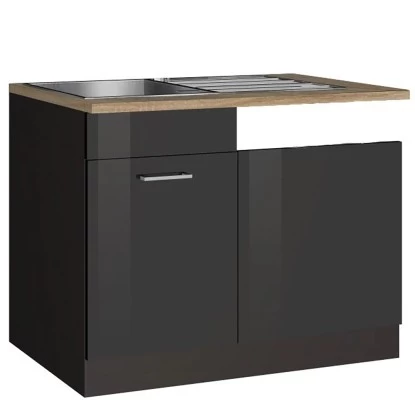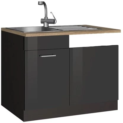 Der Spülenunterschrank von Held Möbel aus der Serie Mailand zeichnet sich durch seine hochglänzende MDF-Front, attraktivem Metallgriff sowie der pflegeleichten Korpus-Kunststoffoberfläche aus. Der Schrank innen ist in Weiß gehalten mit Platz für den teilintegrierten Geschirrspüler. Zusätzlich findet sich hier eine 28 mm starke Arbeitsplatte im Eiche Dekor ohne Ausschnitt für einen variablen Einsatz der Spüle.