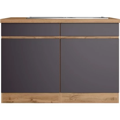 Mit dem Spülenunterschrank Turin von Held Möbel mit hochwertigen MDF-Fronten können Sie ihre Küchenzeile perfekt ergänzen. Hinter den Drehtüren befinden sich insgesamt drei Ablagefächer zur individuellen Nutzung. Optisch begeistert der Spülenunterschrank durch die klaren Linien sowie die zweifarbige Gestaltung. Da der Schrank in zwei Farbkombinationen verfügbar ist, können Sie die Küche im Mix-and-Match Stil einrichten. Inklusive 28 mm starker Arbeitsplatte in Eiche Dekor ohne Ausschnitt für einen variablen Einsatz der Spüle.