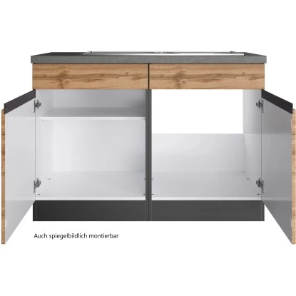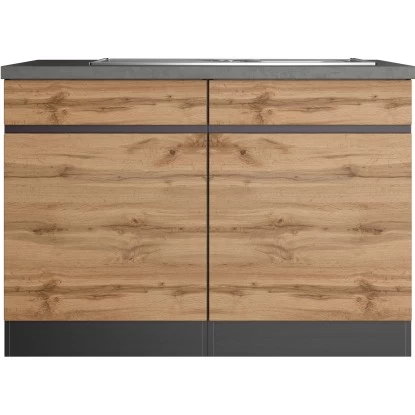 Mit dem Spülenunterschrank Turin von Held Möbel mit hochwertigen MDF-Fronten können Sie ihre Küchenzeile perfekt ergänzen. Hinter den Drehtüren befinden sich insgesamt drei Ablagefächer zur individuellen Nutzung. Optisch begeistert der Spülenunterschrank durch die klaren Linien sowie die zweifarbige Gestaltung. Da der Schrank in zwei Farbkombinationen verfügbar ist, können Sie die Küche im Mix-and-Match Stil einrichten. Eine 28 mm starke Arbeitsplatte in Beton-Optik ohne Ausschnitt für einen variablen Einsatz der Spüle ist inklusive.