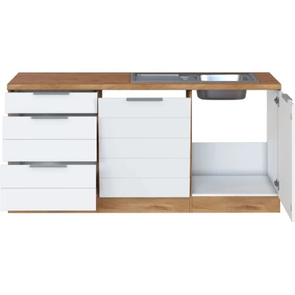 Die Küchenserie FLORENZ besticht durch ihre 2 absolut trendstarken Dekorkombinationen, in denen immer das ausdrucksstarke Wotan-Eichedekor eine entscheidende Rolle spielt. Elegante Metall-Griffleisten an hochwertigen MDF-Fronten mit Lisene in Mattweiß und Mattgrau werden mit einem ausdrucksstarken Eichedekor beim Korpus und der Arbeitsplatte kombiniert. So entsteht eine herausragende Optik, die genau den aktuellen Trend widerspiegelt. Eine Vielzahl an vordefinierten Zeilen und Winkel und verschiedenste Ergänzungsmöbel lassen keine Wünsche offen. In den Auszügen und hinter den Türen wird reichlich Stauraum für Küchenutensilien, Kochgeschirr und mehr geboten. Als Montagehilfe sind die einzelnen Schränke mit höhenverstellbaren Ausgleichsfüßen ausgestattet. Bestimmt werden Sie hier Ihre perfekte Küche finden!