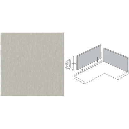Das Verbundelement aus Qualitätsspanplatten (Typ P2 nach DIN EN 312) ist beidseitig mit aufgeklebtem Hochdrucklaminat (HPL) beschichtet. Die Materialstärke beträgt zwischen 13,4 bzw. 13,6 mm. Im Set enthalten sind eine Hart-PVC-Leiste mit farbiger Weichdichtlippe für die Befestigung der Rückwand und Kantenumleimer (650 mm lang, 44 mm breit).