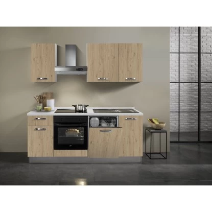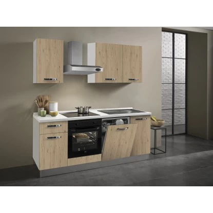 Die eleganten Fronten in Eiche hell werden durch die Arbeitsplatte in Weiß gekonnt akzentuiert. Die warmen Holztöne erzeugen eine einladende Atmosphäre in Ihrer Küche. Die glänzenden Bügelgriffe aus Metall ergänzen harmonisch die edle Gesamtoptik. Trotz ihrer kompakten Breite von 210 cm bietet die Küchenzeile Lola viel Stauraum: Im Unterschrank mit Schublade finden Besteck & Co. ihren Platz. Auch im Spülenunterschrank lässt sich noch so manches unterbringen. Ihre Lebensmittel und Vorräte können Sie mühelos in den Oberschränken unterbringen.