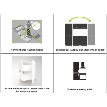 Die Schränke werden vormontiert geliefert, dadurch sparen Sie Zeit und zusätzliche Kosten beim Aufbau. Die Türen der Schränke sind sowohl für den links- als auch für den rechtsseitigen Aufbau vorbereitet, was Ihnen ein Höchstmaß an Flexibilität bei der Montage bietet. Die hochwertigen und pflegeleichten Melaminfronten und die stabile Bauweise der Schrankkörper garantieren Ihnen lange Freude an Ihrer Küche.