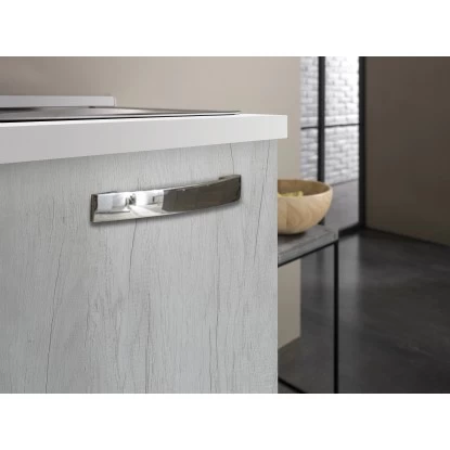 Die eleganten Fronten in Eiche Weiß werden durch die Arbeitsplatte in Weiß gekonnt akzentuiert. Die hellen Holztöne erzeugen eine frische, einladende Atmosphäre in Ihrer Küche. Die glänzenden Bügelgriffe aus Metall ergänzen harmonisch die edle Gesamtoptik. Trotz ihrer kompakten Breite von 210 cm bietet die Küchenzeile Sandra viel Stauraum: Im Unterschrank mit Schublade finden Besteck & Co. ihren Platz. Auch im Spülenunterschrank lässt sich noch so manches unterbringen. Ihre Lebensmittel und Vorräte können Sie mühelos in den Oberschränken unterbringen.