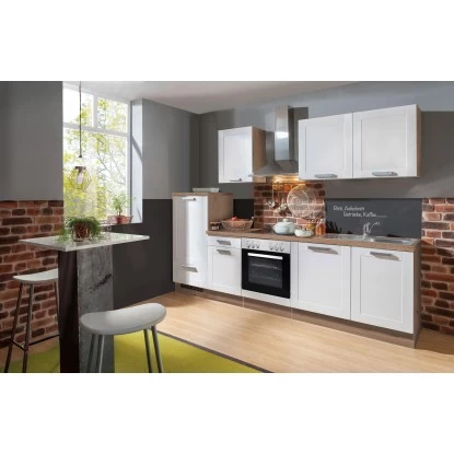 Die Küchenzeile Artisan Premium 270 cm in Landhaus Weiß überzeugt mit zeitloser Optik und durch ein unschlagbares Preis-Leistungsverhältnis. Die Küche besticht insbesondere durch die Kombination aus Design, Funktion und Robustheit. Sie besteht aus Kühlschrank mit ***Gefrierfach, Edelstahl-Herd mit Backofen und Dunstabzugshaube, Spüle mit Unterschrank, einem weiteren Unterschrank mit Schublade, einer Schublade unter dem Kühlschrankumbau und Hängeschränken. Die Arbeitsplatte wird ohne Ausschnitte in einer Stärke von 38 mm geliefert.