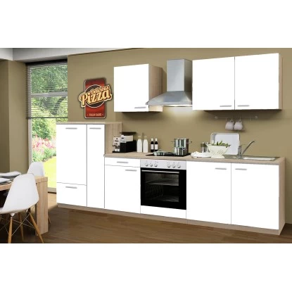 Die Küchenzeile Classic mit einer Breite von 300 cm überzeugt mit zeitloser Optik und ein unschlagbares Preis-Leistungsverhältnis. Die Küche besticht insbesondere durch die Kombination aus Design, Funktion und Robustheit. Alle Möbelteile werden in Deutschland gefertigt und zeichnen sich durch hochwertige Qualität aus. Die teilweise mit Schubladen ausgestatteten Unterschränke, die Hängeschränke und der Apothekerschrank bieten viel Stauraum für Ihre Küchenutensilien. Zudem sorgen die modernen Elektrogeräte für hohen Komfort beim Kochen. Die Küchenzeile besteht aus Kühlschrank mit 3-Sterne-Gefrierfach, Edelstahl-Herd mit Backofen und Dunstabzugshaube, Spüle mit Unterschrank, einem weiteren Unterschrank mit Schublade, einer Schublade unter dem Kühlschrank, Apothekerschrank und Hängeschränken. Die Arbeitsplatte wird ohne Ausschnitte in einer Stärke von 28 mm geliefert.