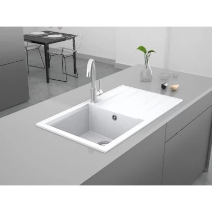 Der verwendete Granitverbundwerkstoff begeistert mit einer natürlichen Granit-Optik. Durch die Farbgestaltung in Weiß harmoniert die Spüle ideal mit ihrer Natursteinarbeitsfläche. Zu den Materialeigenschaften gehören eine hohe Robustheit sowie Stoßfestigkeit. Zudem ist die Einbauspüle hitzebeständig, sodass auch heiße Kochtöpfe problemlos abgestellt werden können. Darüber hinaus lässt sie sich mühelos und schnell reinigen. Es ist wichtig, dass bei der Reinigung von Granitspülen keine chemischen Reinigungsmittel mit ätzenden Eigenschaften, z. B. Chlor, oder Milch mit scharfen abrasiven Bestandteilen zu verwenden. Für die perfekte Pflege und Reinigung der Spüle empfehlen wir den Reiniger und Pflegemittel von Miló, welche separat erhältlich sind.
