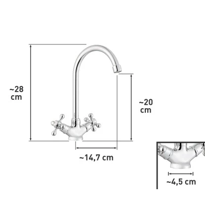 Das Wasser können Sie individuell an den zwei Kreuzgriffen warm und kalt regulieren. Diese sind durch ihre Form selbst mit nassen Händen einfach zu bedienen. Dazu lässt sich der hohe Auslauf um 360° schwenken und somit ideal einsetzen. Bei der Herstellung der Zweigriffarmatur wurde robustes Messing verwendet, das verchromt wurde. Zudem verfügt der Wasserhahn über geprüfte Keramikoberteile sowie eine wertige Mischdüse für einen weichen Wasserstrahl. Der Anschluss ans Ventil erfolgt einfach mit den flexiblen Anschlussschläuchen, die der aktuellen Trinkwasserverordnung entsprechen. Sie sind im Lieferumfang enthalten.