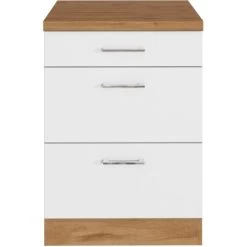 Front und Korpus bestehen aus melaminbeschichteten Qualitätsspanplatten. Der Korpus lässt sich dank einfach anwendbarer Minifix-Excenter-Verbindungstechnik leicht montieren. Gegen Feuchtigkeit schützen die rundum beschichteten Korpuskanten. Die Griffe sind im jeweiligen Schrankpaket bereits enthalten.