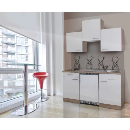 Die trendige Respekta Küchenzeile mit einer Breite von 150 cm eignet sich ideal für den Singlehaushalt oder das Kleinraumbüro. Die Küchenzeile fügt sich dank der harmonischen Farbgebung in Weiß und Eiche-Sonoma-Sägerau-Dekor in jeden Wohnstil ein. Die Farbkombination erlaubt Individualisten viel Freiraum zur kreativen Einrichtung und ist dank seines zurückhaltenden Stils auch ideal für den Büroalltag. Die Singleküche bietet zudem eine gute Ausstattung, dazu zählen ein Unterbaukühlschrank, ein Zwei-Zonen-Glaskeramikkochfeld, sowie Ober- und Unterschränke für allerlei Kochutensilien.
