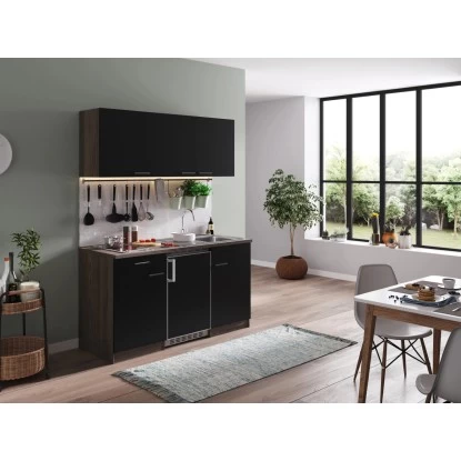 Drei Oberschränke sowie Unterschränke und Schubladen bieten viel Stauraum für Ihre Küchenutensilien und Vorräte. Das Domino-Kochfeld mit zwei Kochzonen, ein Einbaukühlschrank mit drei Sterne Gefrierfach und die Edelstahl Einbauspüle machen die Küchenzeile zum geschmackvollen und funktionellen Einrichtungselement auf kleinem Raum.