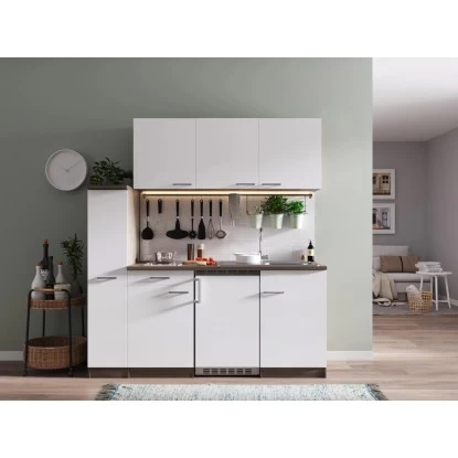 Der Apothekerschrank, drei Oberschränke sowie Unterschränke und Schubladen bieten viel Stauraum für Ihre Küchenutensilien und Vorräte. Das Domino-Kochfeld mit zwei Kochzonen, ein Einbaukühlschrank mit drei Sterne Gefrierfach und die Edelstahl Einbauspüle machen die Küchenzeile zum geschmackvollen und funktionellen Einrichtungselement auf kleinem Raum.