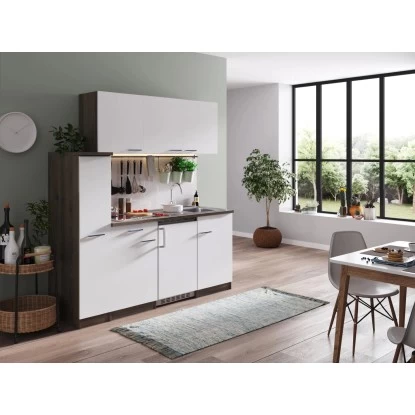 Die Respekta Küchenzeile ist mit einer Breite von 180 cm die perfekte Küche für Ferienwohnungen oder Zweitwohnsitze. Die Kombination aus dem Korpus in Eiche York Optik und den Frontfarben in Grau, Rot, Schwarz oder Weiß macht die kompakte Single-Küche zu einem wahren Blickfang.