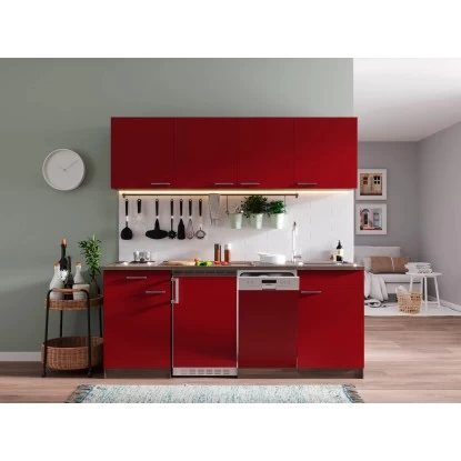 Vier Oberschränke sowie Unterschränke und Schubladen bieten viel Stauraum für Ihre Küchenutensilien und Vorräte. Zudem sind die Zeiten des Abwasches mit dem teilintegrierten Geschirrspüler vorbei. Das Domino-Kochfeld mit zwei Kochzonen, ein Einbaukühlschrank mit drei Sterne Gefrierfach und die Edelstahl Einbauspüle machen die Küchenzeile zum geschmackvollen und funktionellen Einrichtungselement auf kleinem Raum.