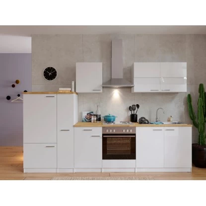 Ein funktioneller Küchenblock mit bereits integrierten Elektroeinbaugeräten der Energieeffizienzklassen A bzw. A+. Der Küchenblock weiß mit einem zeitlosen Design und einer aktuellen Farbkombination zu gefallen. Dank der hochwertigen Ausstattung, ist Ihnen ein hohes Maß an Komfort garantiert. Als besonderes Extra sind alle Scharniere mit der komfortablen Soft-Close Funktion ausgestattet. Der Küchenblock verfügt über eine Gesamtbreite von 300 cm und lässt sich ganz nach Ihren Wünschen wechselseitig aufbauen. Alle Holzteile sind zerlegt und eignen sich dank einer detaillierten Aufbauanleitung zur einfachen Selbstmontage.