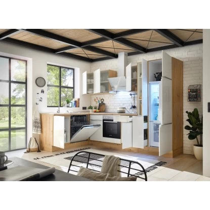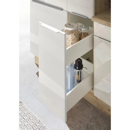 Das Respekta Küchenzeile Marleen ist in verschiedenen Farben erhältlich und schafft durch den Materialmix von Elementen in Holz- und Griffleisten in Aluminiumoptik ein modernes Design. Die Schränke bieten Ihnen viel Stauraum und schließen dank der Soft Close Funktion besonders geräuscharm. Unebenheiten im Boden gleichen Sie mit den höhenverstellbaren Füßen ganz einfach aus. Die Zeile kommt in Winkelform.
