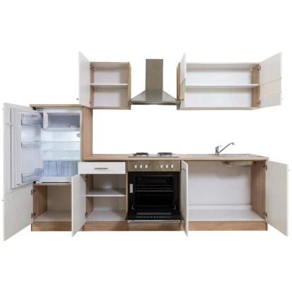 Ihre Wunschküche nimmt Form an – Mit der modernen und flexiblen respekta Küchenzeile gestalten Sie Ihre individuelle Traumküche. Die 270 cm breite Küchenleerzeile überzeugt durch eine ausgezeichnete Qualität und eine stilvolle Farbgestaltung. Das attraktive Design, wird durch die hochwertigen Metall-Stangengriffe im wunderschönen Edelstahl-Look eindrucksvoll in Szene gesetzt. Neben diesem exklusiven Erscheinungsbild, bieten Ihnen die Schränke eine Vielzahl von Stauraummöglichkeiten für Ihre Küchenutensilien und Vorräte und sind darüber hinaus, als besonderes Extra, mit einer komfortablen Soft-Close Funktion ausgestattet.