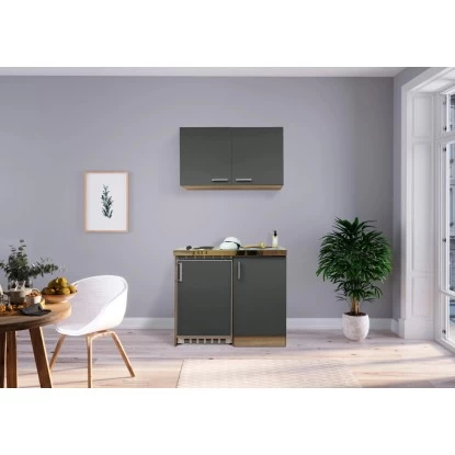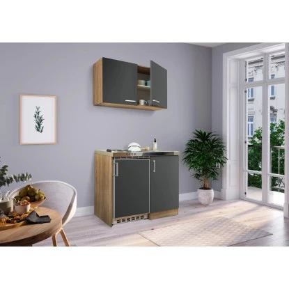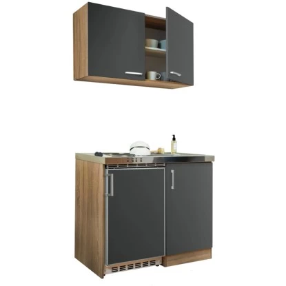 Die ideale Küche für das perfekte Kochvergnügen auf kleinstem Raum. Die kompakte Respekta Miniküche MK100ESGOS zeichnet sich als äußerst praktisch und platzsparend aus und verspricht Ihnen dennoch ein Höchstmaß an Komfort. Dazu verfügt die 100 cm breite Miniküche über einen Kühlschrank mit Gefrierfach, eine Pantryauflage mit 2-Platten Kochmulde sowie über einen Unter- als auch einen Oberschrank zur optimalen Lagerung Ihrer Küchenutensilien. Der schicke und zeitgemäße Eiche Sonoma Sägerau (Nachbildung) Korpus in Verbindung mit den grauen Fronten machen Ihre neue Miniküche zu einem Blickfang. Die attraktive und überaus preiswerte Miniküche wird Ihnen zerlegt nach Hause geliefert und eignet sich dank einer detaillierten Montageanleitung zum einfachen und schnellen Selbstaufbau. Die Küchenzeile ist wechselseitig aufbaubar und ermöglicht Ihnen somit eine individuelle Aufteilung aller einzelnen Schränke.
