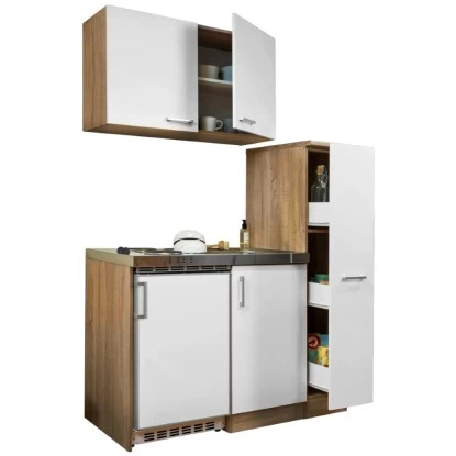 Die ideale Küche für das perfekte Kochvergnügen auf kleinstem Raum. Die kompakte Respekta Miniküche MK130ESWOS zeichnet sich als äußerst praktisch und platzsparend aus und verspricht Ihnen dennoch ein Höchstmaß an Komfort. Dazu verfügt die 130 cm breite Miniküche über einen geräumigen Apothekerschrank, einen Kühlschrank mit Gefrierfach, eine Pantryauflage mit 2-Platten Kochmulde sowie über einen Unter- als auch einen Oberschrank zur optimalen Lagerung Ihrer Küchenutensilien. Der schicke und zeitgemäße Eiche Sonoma Sägerau (Nachbildung) Korpus in Verbindung mit den weißen Fronten machen Ihre neue Miniküche zu einem Blickfang. Die attraktive und überaus preiswerte Miniküche wird Ihnen zerlegt nach Hause geliefert und eignet sich dank einer detaillierten Montageanleitung zum einfachen und schnellen Selbstaufbau. Die Küchenzeile ist wechselseitig aufbaubar und ermöglicht Ihnen somit eine individuelle Aufteilung aller einzelnen Schränke.