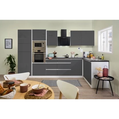 Die Respekta Premium Winkelküche ist die ideale Küche für eine Wohngemeinschaft oder Familie. Die grauen Hochglanzfronten und die Arbeitsplatte in Granit-Optik bilden einen schönen Kontrast zum weißen Korpus. Genug Stauraum bieten die zahlreichen Ober- und Unterschränke mit grifflosem Design. Die Küche verfügt über eine ergonomische Arbeitshöhe von 91 cm und lässt sich ganz nach Ihren Wünschen wechselseitig aufbauen.
