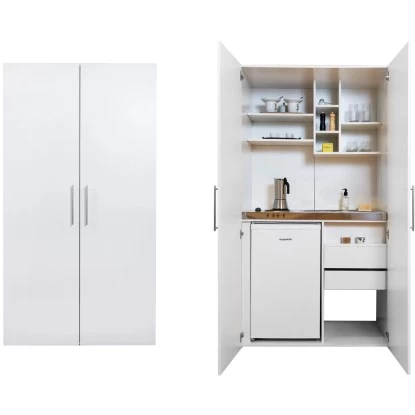 Die Respekta Schrankküche SKWW in Weiß ist eine praktische Miniküche und eignet sich optimal für die Verwendung im Büro oder in kleinen Wohnungen. Die kleine Einbauküche ist innen wie außen ein echtes Raumwunder und bietet alle nötigen Funktionen für die Zubereitung von einfachen Gerichten. Dank der cleveren Verkleidung sieht die Küche im geschlossenen Zustand aus wie ein herkömmlicher Schrank.