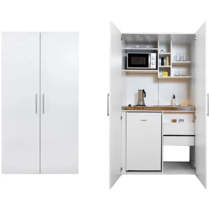 Die Respekta Schrankküche ist innen wie außen ein echtes Raumwunder und macht sich perfekt in Büro- und Besprechungsräumen. Dank ihrer kompakten Maße mit einer Breite von nur 104 cm, eignet sich die Miniküche auch ideal für Singlewohnungen und Ladenlokale mit wenig Raumfläche. Die matten Türfronten mit ihren dezenten Metallgriffen verdecken gekonnt die komplette Küchenausstattung und sorgen bei geschlossenen Türen sofort für einen aufgeräumten Anblick.