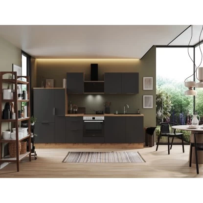 Die Respekta Selection Küchenzeile Elisabeth 310 cm bietet Ihnen alles, was Sie erwarten, um Ihren Traum von einer modernen und funktionalen Küche zu verwirklichen. Mit einer Arbeitshöhe von 91 cm und höhenverstellbaren Sockelfüssen ermöglicht sie Ihnen ein komfortables und ergonomisches Kochen. Dank der Schubkästen und Auszüge mit Vollauszug und Dämpfung, sowie der Glaseinlegeböden bei den Hängeschränken können Sie den Stauraum optimal ausnutzen. Profitieren Sie von der Lieferung fertig montierter Küchenschränke und erhalten Sie eine leistungsstarke und moderne Küchenlösung, die Sie über viele Jahre hinweg begleiten wird.