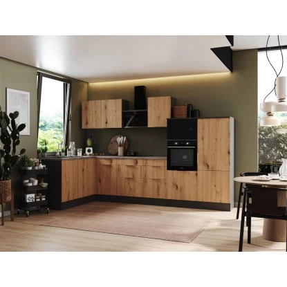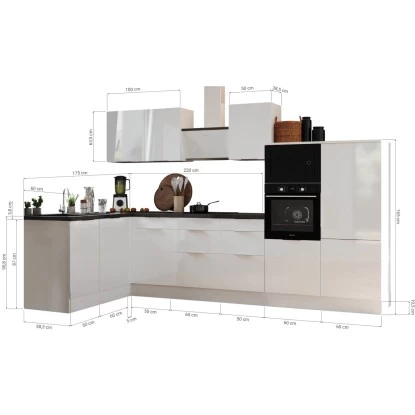 Die Respekta Selection Winkelküche Elisabeth 340 cm bietet Ihnen alles, was Sie erwarten, um Ihren Traum von einer modernen und funktionalen Küche zu verwirklichen. Mit einer Arbeitshöhe von 91 cm und höhenverstellbaren Sockelfüssen ermöglicht sie Ihnen ein komfortables und ergonomisches Kochen. Dank der Schubkästen und Auszüge mit Vollauszug und Dämpfung, sowie der Glaseinlegeböden bei den Hängeschränken können Sie den Stauraum optimal ausnutzen. Profitieren Sie von der Lieferung fertig montierter Küchenschränke und erhalten Sie eine leistungsstarke und moderne Küchenlösung, die Sie über viele Jahre hinweg begleiten wird.