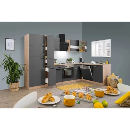 Die Respekta Winkelküche lässt keine Wünsche offen, denn sie überzeugt nicht nur durch ihre formvollendete Gestaltung, sondern auch mit umfangreichen Stauraummöglichkeiten. Die bereits integrierten Elektrogeräte runden diese farblich perfekt abgestimmte Winkelküche mit einer Breite von 310 cm ab. Die harmonisch gestaltete Küche lässt sich ganz nach Ihrem Geschmack wechselseitig aufbauen und ist dank ihres platzsparenden Konzepts auch ideal für kleinere Räume geeignet. Die kopffreie Schräghaube ermöglicht ein angenehmes Kochen und beseitigt die beim Kochen anfallenden Gerüche auf energiesparsame Weise. Der teilintegrierte Geschirrspüler besticht nicht nur durch seinen geringen Energieverbrauch, sondern bietet mit seinen 7 Spülfunktionen das passende Programm für jede nur erdenkliche Situation. Mit einem Gesamtnutzungsvolumen von 222 Litern weiß die Einbau Kühl-Gefrierkombination zu überzeugen und bietet ausreichend Platz für Ihre Lebensmittel und Getränke. Des weiteren sind alle Scharniere und Auszüge der Schränke mit einer komfortablen Soft-Close Funktion versehen (Ausnahme Apothekerschrank und Kühlschrank-Tür).