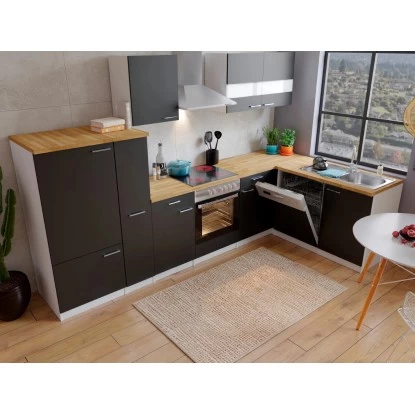 Respekta Winkelküche KBL310WSCG 310 X 172 Cm Schwarz-Weiß-Butcher Nussbaum