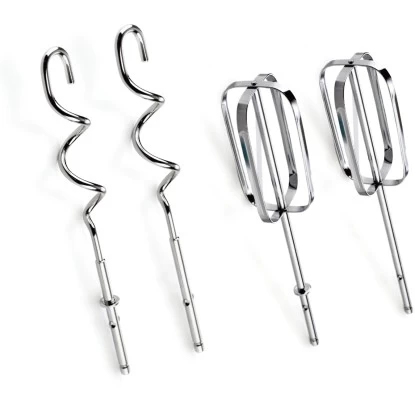 Der Handmixer verfügt über zwei austauschbare Rührbesen und zwei Knethaken aus Edelstahl, die mit Hilfe der Auswerftaste automatisch vom Gerät gelöst werden. Die Rührbesen eignen sich ideal für leichte flüssige Mischungen, wie Creme, Rührteig, Eiweiß, Sahne und vieles mehr.