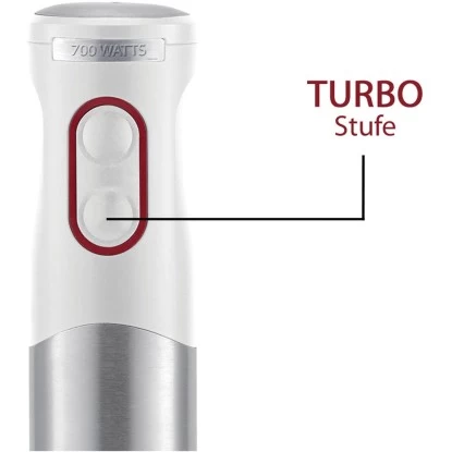 Dank der ergonomischen Form liegt das Gerät bequem in der Hand und ermöglicht einfaches Rühren. Ist er mal nicht in Gebrauch, kann er mittels Aufhänge-Öse platzsparend aufgehängt werden. Der praktische 700 Watt Stabmixer ist schnell einsatzbereit. Schließen Sie ihn am Stromnetz an und halten Sie den bequem erreichbaren Tastschalter zum Pürieren gedrückt. Mit den 2 Leistungsstufen kann die Geschwindigkeit je nach Beschaffenheit der Zutaten und gewünschtem Mixergebnis eingestellt werden. Die Turbostufe, mit der ca. 18.000 Umdrehungen pro Minute erreicht werden, sorgt zudem für bessere Mixergebnisse bei härteren Zutaten.