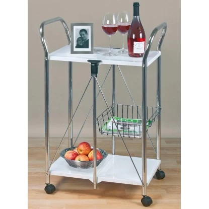 Das robuste Chrom-Metallgestell sorgt dabei für Stabilität. Die Belastbarkeit beträgt bis zu 40 kg. Der Wagen kann mit einem Handgriff zusammengeklappt und damit sehr platzsparend verstaut werden.