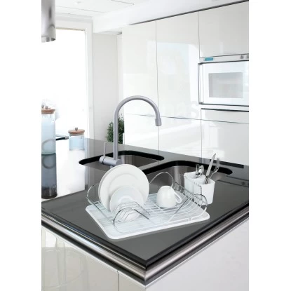 Der hochwertige Geschirrabtropfer Clean mit separatem Auffangtablett verhindert Wasserbildung und beugt Kalkflecken auf der Spülbeckenablage vor. Da es auch im Zeitalter der Spülmaschine immer noch Geschirr und Besteck gibt, das besser von Hand gespült we