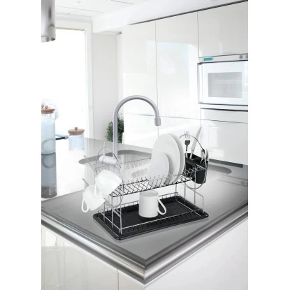 Auf zwei Ablagen bietet der Geschirr-Abtropfer mit exklusiver Kunststoff-Beschichtung und Anti-Rutsch-Effekt reichlich Stellplatz für Teller, Tassen oder Gläser. Der separate Besteckkorb wird seitlich am Regal befestigt. An der anderen Seite verfügt der Premium Geschirr-Abtropfer über zusätzliche Tassenhalter. Auf der unteren Platte finden Tassen und Gläser weiteren Platz. Dabei bleibt die Arbeitsplatte stets trocken.